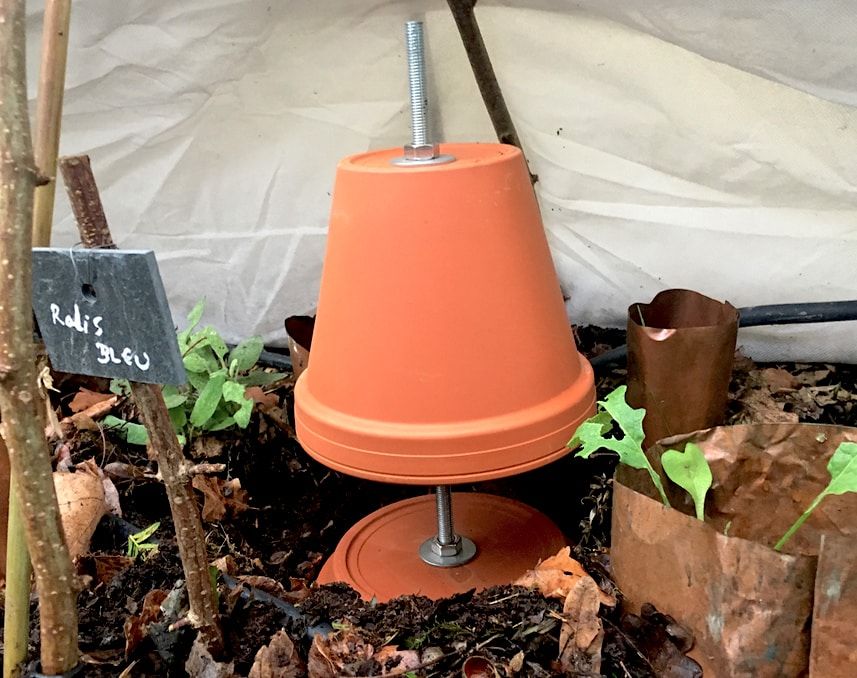 En 2018-2019, nous essayons d’autres méthodes bien que faisons un mix de méthode différentes. Les tunnels en double couche de voiles de forçage sur deux tipis du bac3 et quatre bacs. Dans le cas de ces derniers, nous plaçons des systèmes de chauffage fait maison en pot en argile mais chauffé cette fois avec des verrines d’huile bio.
