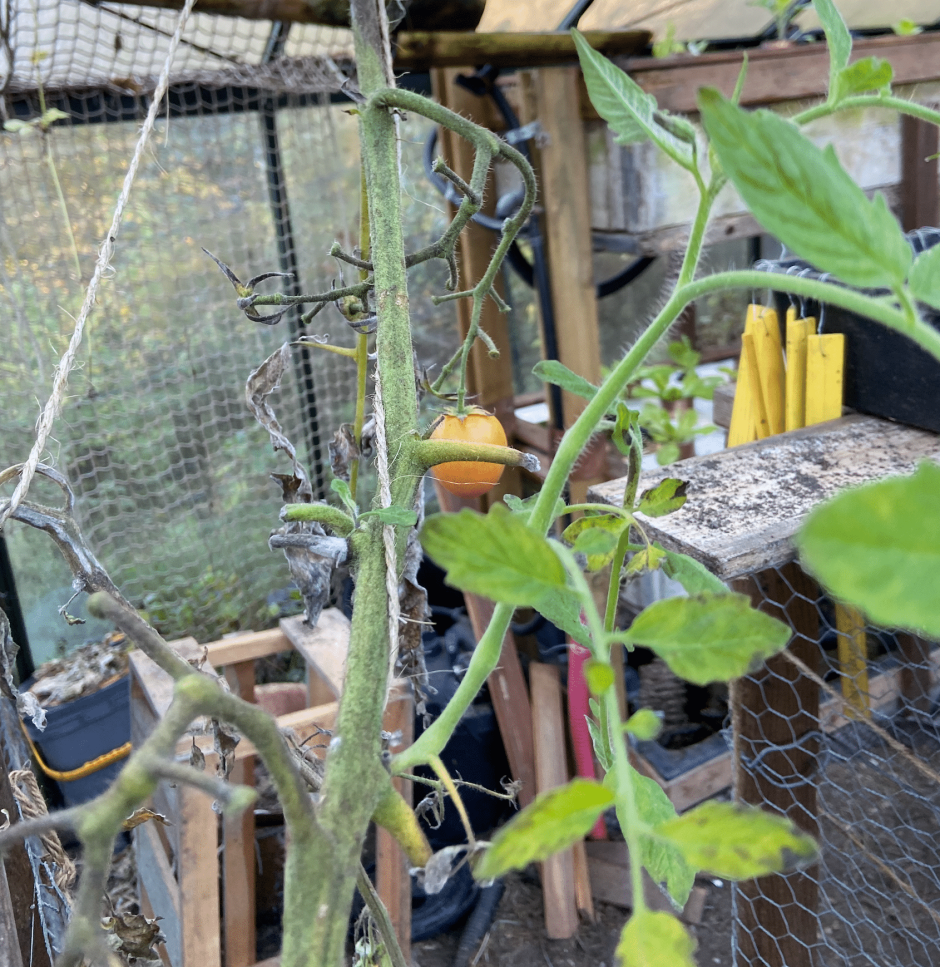 Bien sûr, les tiges commençaient à flétrir comme les feuilles du reste. Vers la mi-novembre, avec l’arrivée d’un soleil généreux, nous avons vu deux gourmands pousser sur les tiges. Ces belles feuilles couronnées de petites fleurs contrastaient avec le vert pourri. Nous étions ébahis de voir cet élan de vie. Il nous semble certain que ce sont ces gourmands qui ont permis à l’ultime tomate, de cette fin de saison, l’Oxheart, de jaunir. Fin décembre, elle est partie dans nos estomacs.