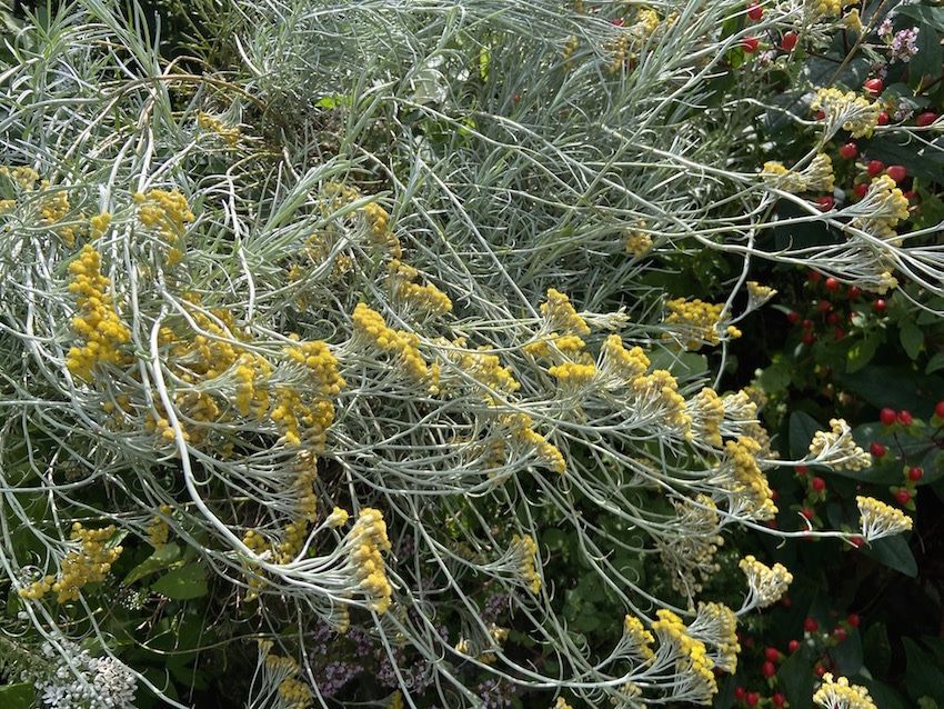 La spirale des aromates est une véritable échelle des plantes aromatiques ayant besoin d’eau ou pas. Nous trouvons, au sommet, la moins gourmande en eau. Il porte un magnifique buisson dont les feuilles sont argentées et les fleurs jaunes exhumant un délicat parfum de curry. Il s’agit de l’hélichryse italienne (Helichrysum italicum) (Photo d’entête). arrive en seconde position le thym (Thymus vulgare). Il existe d’autres thymus qui ont besoin de plus d’humidité que l’on placera alors en bas de la spirale, près de la mare. Il est suivi par l’origan qu’il faut placer au sud. Notez-bien, nous avons une rangée d’origan plein nord dans une des parcelles de notre potager qui s’épanouissent remarquablement bien. Nous en avons parlé dans un article précédent.