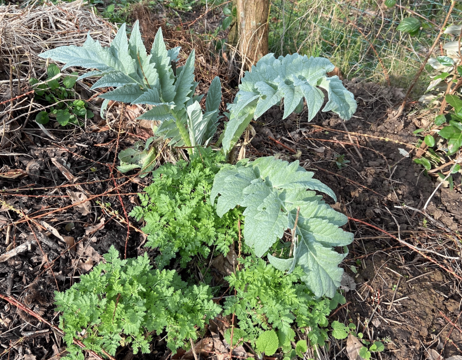 Pour la petite histoire, nous avons fait une expérience inusitée dans notre potager en 2020. Nous avions une matricaire romaine (Chamaemelum nobile) qui avait une fâcheuse tendance à prendre trop de place, à côté d’une ciboule welsche, tout en restant de petite taille (40 cm environ) dans un de nos bacs. Nous l’avons déplacé vers un de nos jardins des Simples. Il nous restait une belle place à côté d’un cardon qui végétait depuis le début du potager.