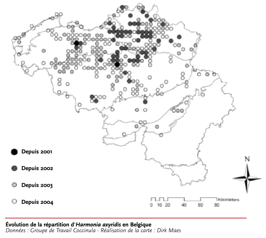 La coccinelle Harmonia a été introduite, volontairement, en Flandre en l’an 2000. Le but ? le biocontrôle, croyant pouvoir venir à bout des pucerons, dans les cultures sous serres.1 Elle présente une très grande variabilité de couleurs entre individus. Elle s’est répandue rapidement, en moins de quatre ans, sur l’ensemble de la Flandre avec quelques incursions en Wallonie, comme le montre la carte ci-dessous.