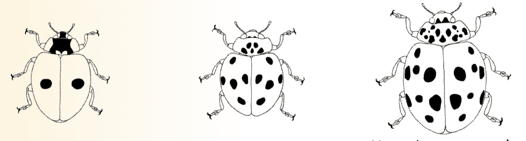 « M », clair avec « patte de chat » (une tache centrale avec 4 autres taches en demi-cercle autour) sans taches supplémentaires et, enfin, noir avec deux larges bandes claires. Il existe une espèce indigène avec un dessin en patte de chat mais elle est plus petite et les espèces indigènes qui mesurent plus de 5 mm ont un dessin différent sur le pronotum. - Les coccinelles asiatiques se caractérisent par une petite bosse à l’extrémité de leurs élytres alaires. Si vous voyez cela, vous pouvez être sûr qu’il s’agit d’une espèce asiatique car les espèces indigènes n’ont pas cela.