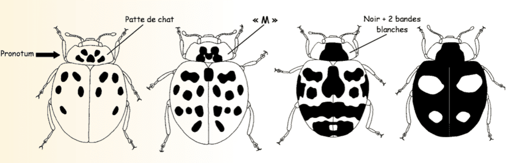Quatre formes parmi les plus courantes d’Harmonia axyridis. On remarque les trois types de dessins sur le pronotum (de gauche à droite) : patte de chat, « M », noir avec 2 larges bandes blanches. Il s’agit en fait d’un continuum : les taches de la patte de chat fusionnent pour donner le « M » qui donne le troisième dessin si la fusion est encore plus importante. NB : le nombre de taches est très variable.