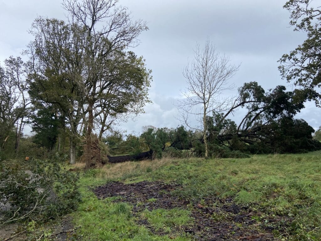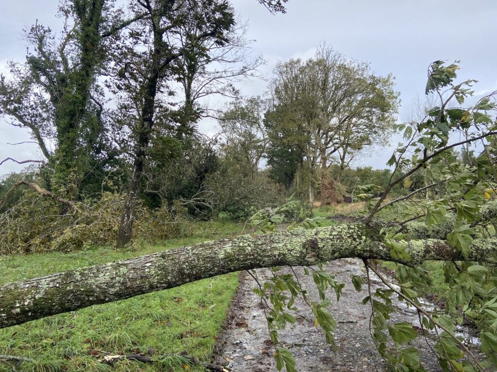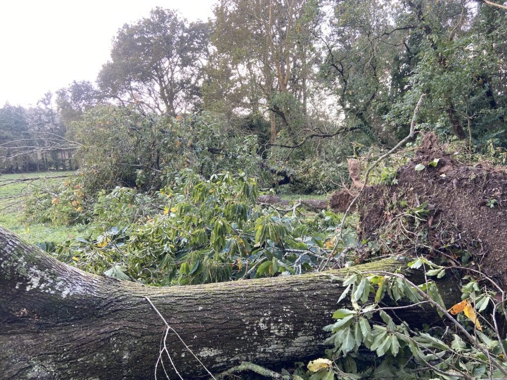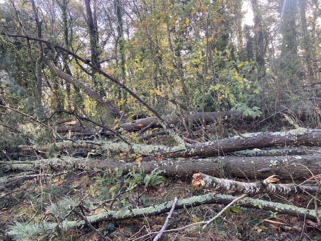 Sur les milliers d’arbres qui sont autour de moi, plusieurs centaines sont tombés sur le sol laissant de grands espaces vides. La tempête Ciaran n’en est pas une. C’est un véritable ouragan qui a emporté autant d’arbres, branches et…quelques ardoises et autres zinc de la maison.