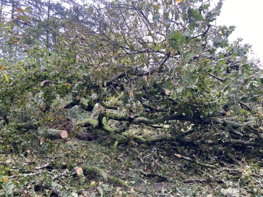 Le matin, c’est la découverte du chaos. Nous sommes coupés du monde. Plus d’électricité, d’internet, de téléphone. Il n’y a même plus moyen d’aller au bourg tant les arbres traversent les chemins et les routes. Et l’on commence à entendre le concert des tronçonneuses, dans la campagne, le bruit sourd d’un tronc qui tombe au sol, appuyé miraculeusement, en équilibre, sur un autre arbre, comme dans une étreinte mortelle.