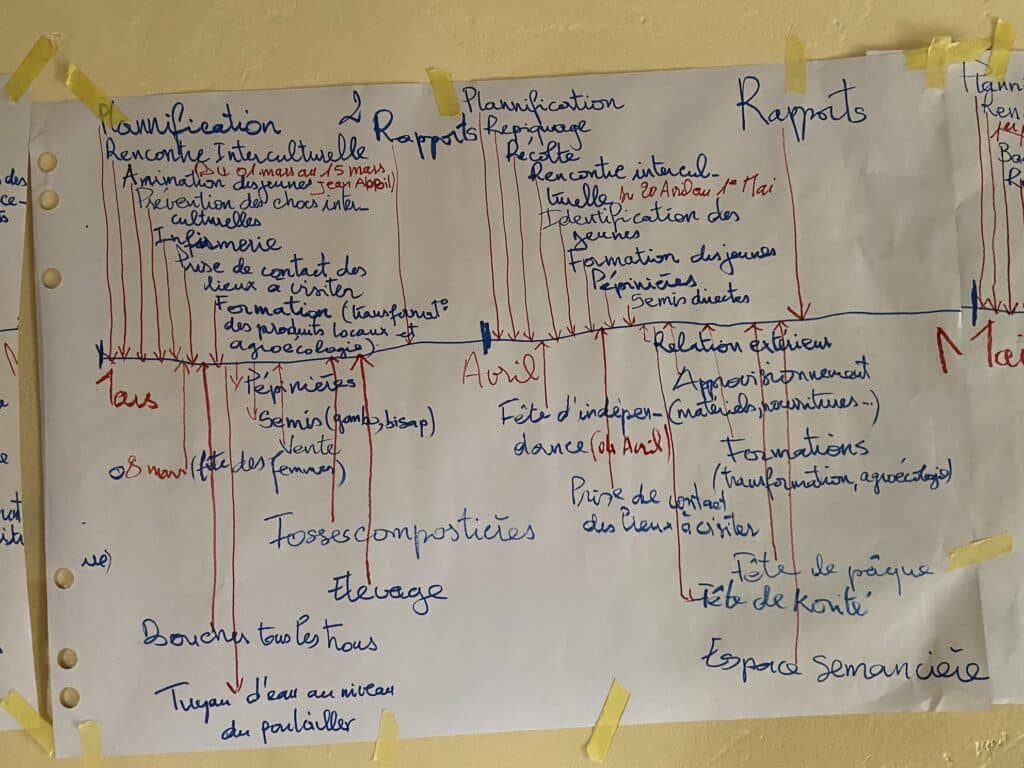 Plus d’une centaine de fonctions ont été identifiées pour une bonne gestion de la ferme pédagogique. Ainsi, dans les grandes lignes, Moussa est responsable des cultures et de la formation donnée aux participants, François est responsable de la vente des produits et de la gestion du matériel de la ferme. Éverienne est responsable relations publiques et des rencontres interculturelles. Ces fonctions ont été réparties sur une ligne du temps qui dure un an. Chaque année, l’équipe devra recommencer cette ligne du temps.