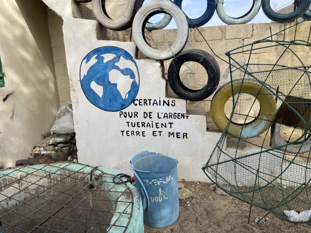 Nous avons découvert son projet de sensibilisation et de recyclage part l’art. C’est une très belle solution pour piéger les plastiques qui volent dans tous les sens dans la plupart des villages au Sénégal. L’aspect du village de Ndoumboudj est assez désespérant. Ce n’est pas le sol que l’on voit mais des milliers de sachets en plastique qui jonchent le sol accompagnés de déchets de toute nature.