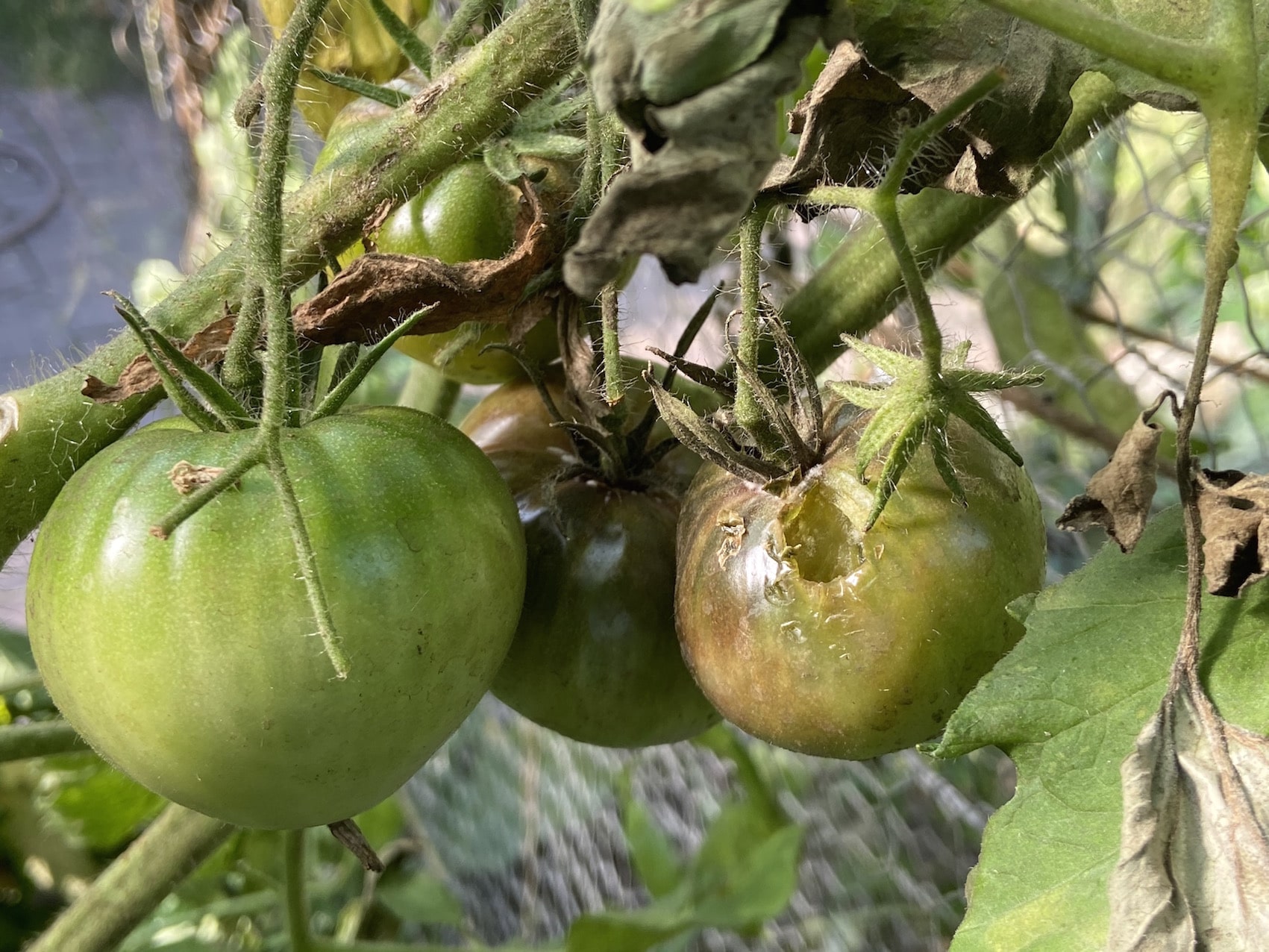 Lors d’une visite auprès de maraîchers, début août, nous avons constaté que les tomates présentes dans les serres commençaient à subir des attaques par le parasite avec un décalage de quelques semaines. Pour contrer ce phénomène qui n’était pas encore arrivé chez nous, nous avons pulvérisé une décoction d’ail. Certes le processus d’attaque a été freiné pendant quelques jours, mais cela n’a pas suffi. Nous constatons une avancée inexorable de la maladie bien que nous constatons un certain ralentissement.
