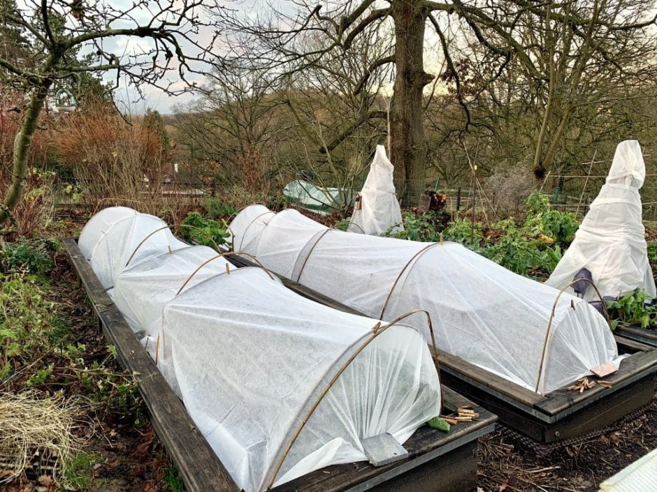 Bien que la rhubarbe soit capable de passer les périodes de gel, lui donner un petit coup de main n’est pas pour lui déplaire. Les artichauts et les asperges sont bien couverts, il reste encore plus d’un légume qui cherche les moments ensoleillés pour continuer à pousser.
