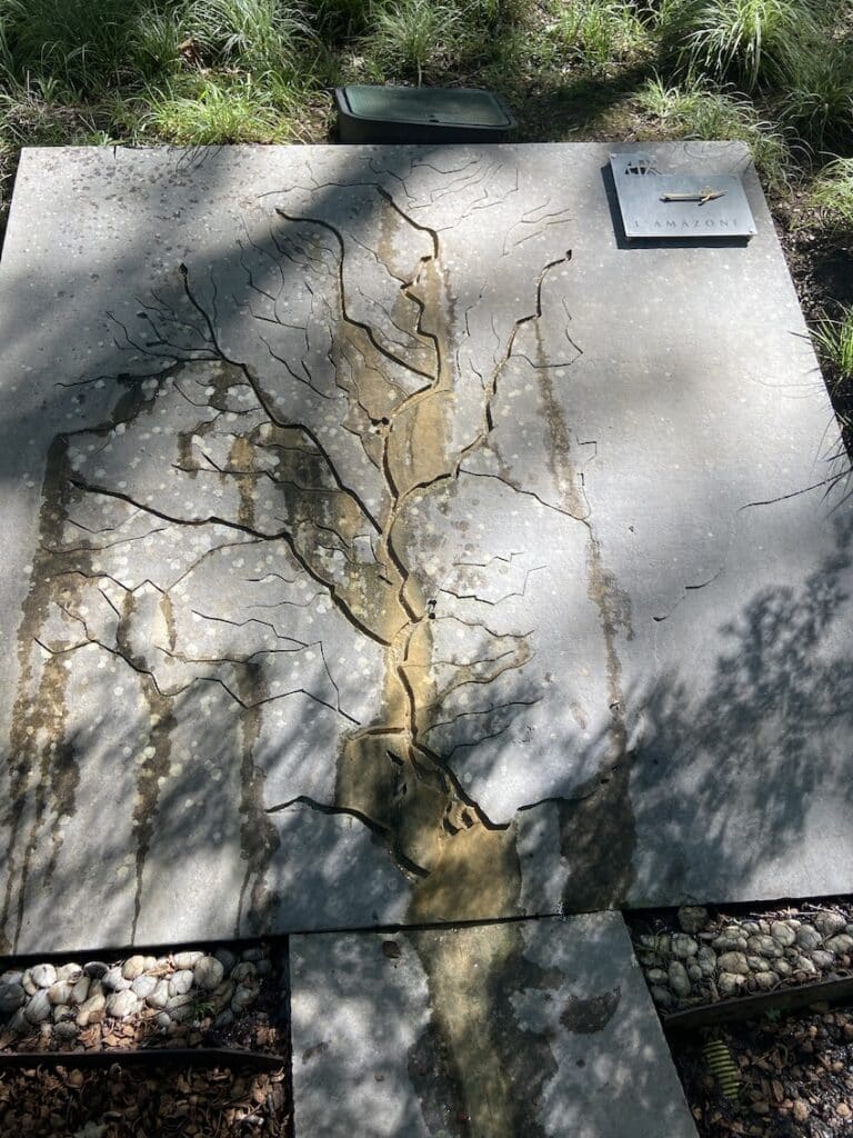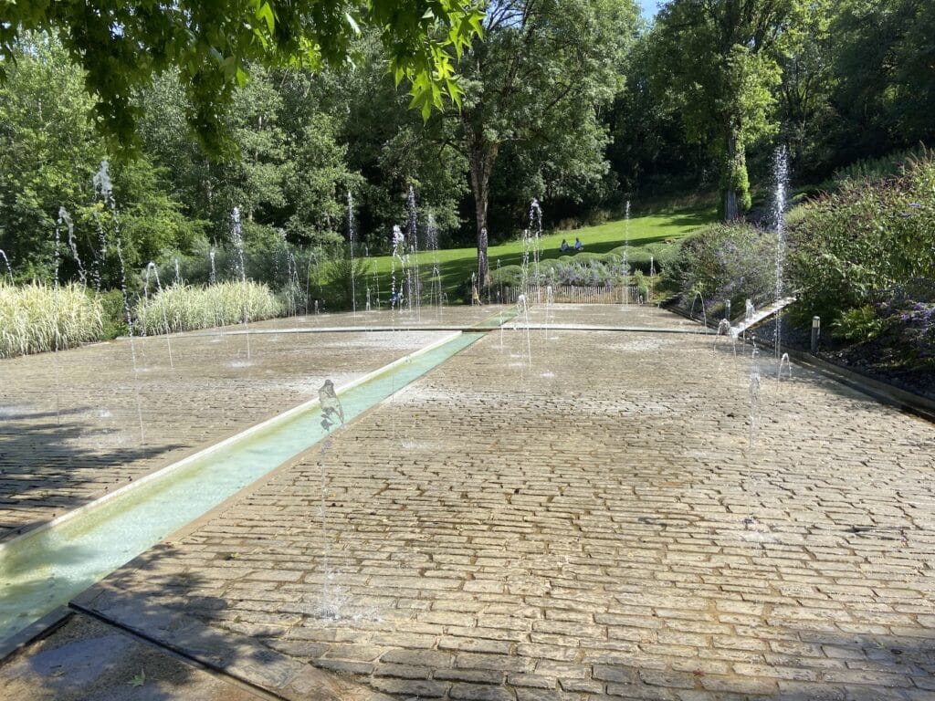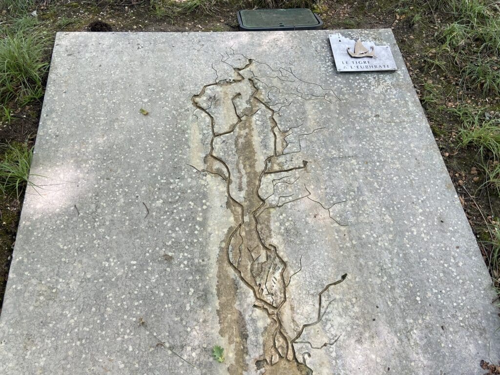 Je me suis arrêté auprès de dalles gravées avec la représentation des cinq plus grands fleuves du monde ! Ces dalles étaient sculptées en creux, ce qui permettait de laisser passer un mince filet d’eau, de la source à la mer. Les cinq cascadelles issues des fleuves s’écoulent à travers les buis du bois sacré, en contrebas, pour se jeter ensuite dans la Vézère. Le message laissé par les concepteurs de ces jardins est de dire que la planète Terre est aussi notre jardin que nous devons apprendre à respecter.
