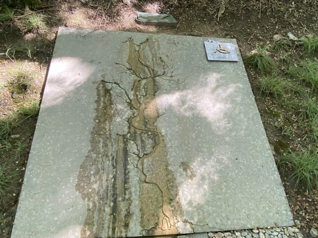 - Cette longue pente bordée de buis est le premier lieu. Il s’agit du bois sacré. Jadis le buis permettait de conjurer les mauvais sorts. Les 2500 buis font de ce lieu l’endroit du repos des dieux, il y a bien longtemps déjà. Le murmure de l’eau les berce dans leur profond sommeil. ↩︎