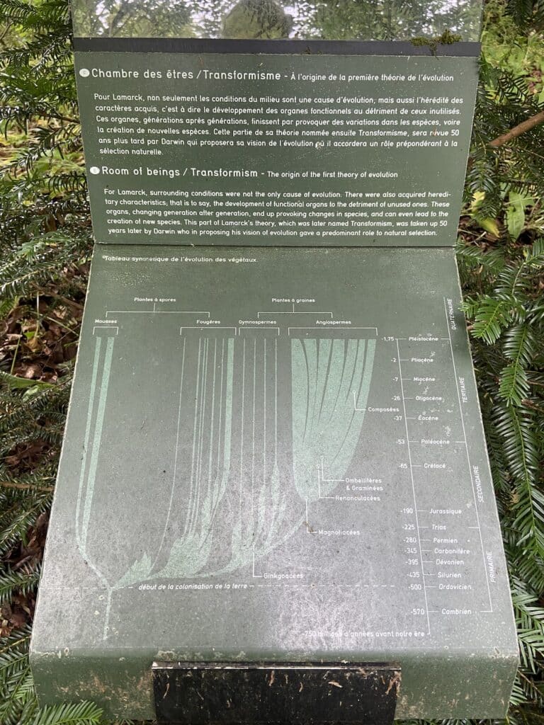 Des panneaux ponctuent la visite montrant l’échelonnement de l’arrivée des hominidés il y a 50.000 ans. En montant les escaliers, je suis passé par toutes les étapes. Du monde minéral à l’apparition du plancton jusqu’à l’arrivée des mamifères. Les insectes et donc les fleurs nous montre la reproduction sexuée. La boucle est bouclée, le bas de la pente nous montre les premières plantes. Le haut nous décrit la vision de l’évolution selon Jean-Baptiste Lamarck.