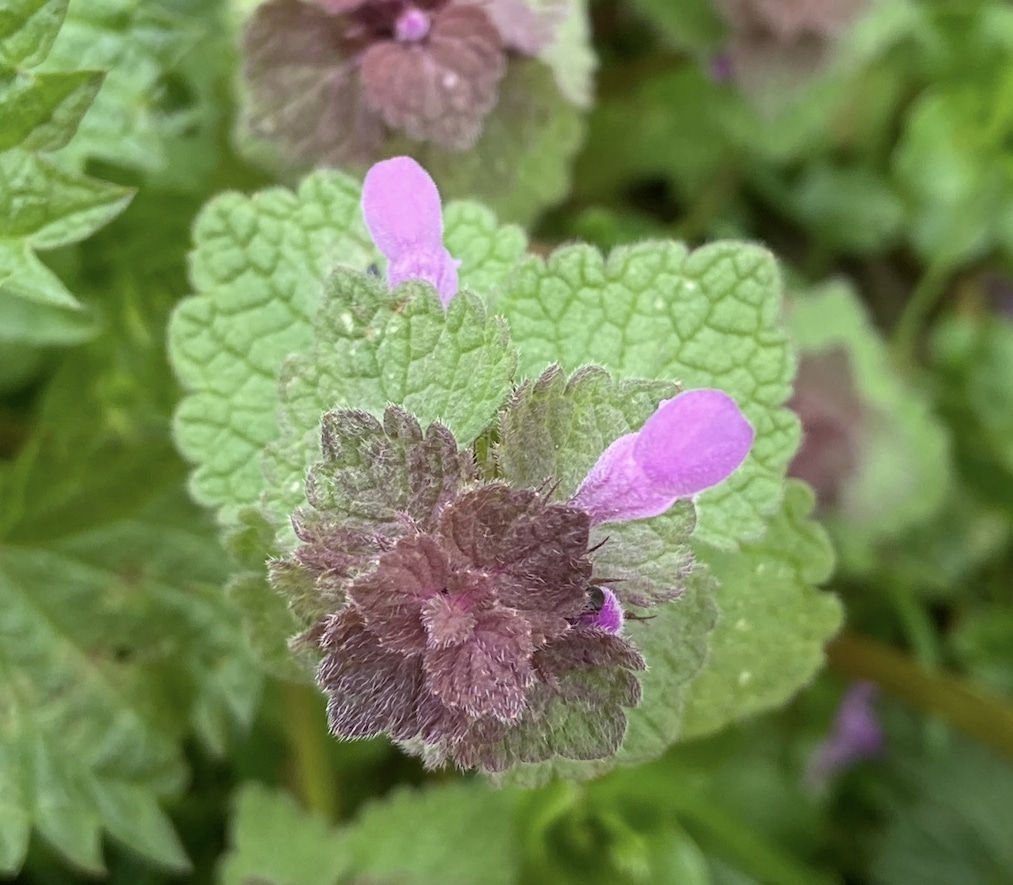 Deux noms pour la même plante ? Pas tout à fait. Ces plantes ont quelques nuances qui en font deux plantes différentes avec des fleurs toutes aussi rosse l’une que l’autre. Mais pour éviter la confusion entre Lamier Pourpre et Lamier Amplexicaule,17 il faut être attentif à la position des fleurs. La forme des feuilles a aussi son importance puisque les feuilles supérieures du Lamier Amplexicaule sont embrassantes. Le lamier pourpre porte le nom vernaculaire d’ortie rouge.