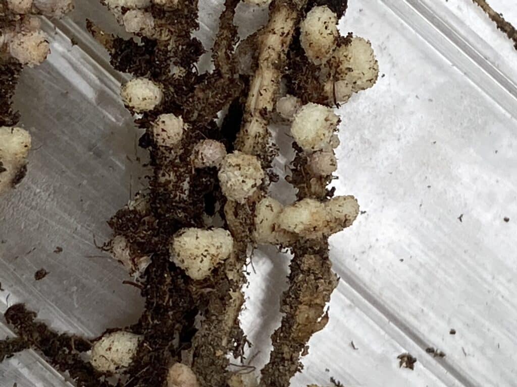La racine a un pivot qui pénètre dans le sol à une profondeur d’environ 1 mètre. Sur les racines se trouvent des bactéries nodulaires qui assimilent l’azote de l’air et le transforment en composés disponibles pour la plante. La structure de la racine du plant de pois est très simple.