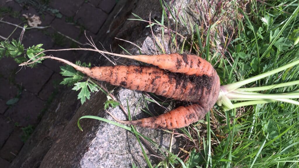 Bien sûr, les légumes les plus moches se retrouvent chez les légumes-racine. La carotte est un bel exemple d’autant que la racine pivot ne supporte pas les obstacles. C’est d’ailleurs pour cela que l’on dit que la carotte ne se repique jamais. Il faut la semer dans un sol meuble, où les mottes de terre ont été finement concassées, voire même dans un sol sableux.