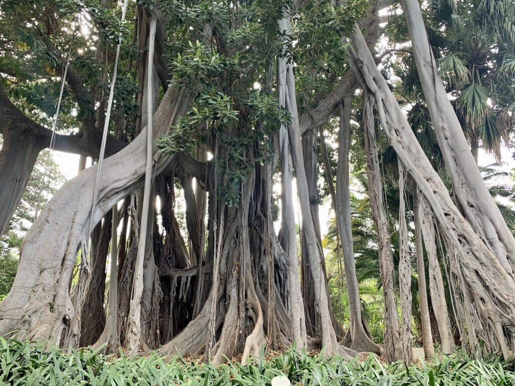 Un autre exemple de racines aériennes encore plus spectaculaires, ce sont celles du Ficus de la baie de Moreton. 11 Cet arbre est originaire de la baie éponyme en Australie. Florian et moi avons découvert cet arbre lors d’une de nos pérégrinations, cette fois sur l’île espagnole de Tenerife. Dans le Jardín de aclimatación de la Orotava, le Ficus macrophylla var. columnaris s’est présenté à nous de façon magistrale. Son aspect impressionnant se caractérise par ses racines aériennes ramifiées, de soutien, qui rejoignent le sol et se transforment en autant de troncs supplémentaires. Ce sont de véritables piliers qui favorisent le maintien du poids de la partie sommitale de l’arbre. Cet arbre a un besoin d’eau colossal. De ce fait, s’il est planté en ville, il vaut mieux l’éloigner des canalisations d’eau qu’il est capable de cannibaliser.