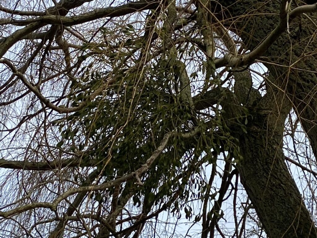 Plus près de chez nous, nous pouvons comparer cette plante au Gui Viscum album qui colonise certains de nos arbres. A contrario du Tillandsia usneoides, le Gui, effectivement est une plante sans racine, mais elle parasite en partie son hôte. Le Gui possède un à deux suçoirs qui lui permet de prélever qu’une partie de la sève à son hôte (eau et les sels minéraux). On dit alors qu’il est hémiparasite. Il s’agit d’un sous-arbrisseau de la famille des Santalaceae. Quelques Viscum album parasitent ainsi le saule pleureur de notre potager d’Éghezée.