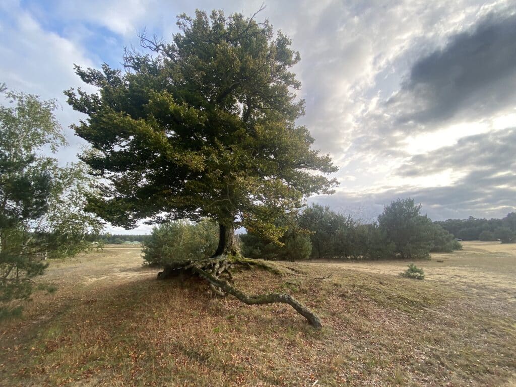 Sans transition, dans les Fagnes belges, j’ai rencontré une racine étonnante. Elle sortait de terre en remontant vers le haut pour plonger aussitôt dans le sol, créant ainsi un demi-cercle au-dessus du sol. Il est très probable que la racine a rencontré un obstacle rigide l’ayant contourné. C’était probablement un caillou rond. Ayant passé ma main dans cet espace intérieur, la racine est parfaitement sphérique.