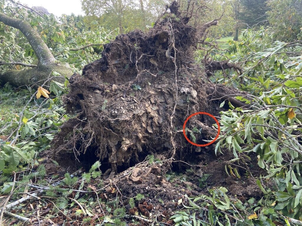 Quand les chercheurs nous indiquent que les racines du hêtre ne s’enfoncent que de 2 à 3 m dans le sol, je finis par douter de leurs conclusions. Certes, quand un arbre est déraciné par une tempête comme celle de novembre 2023 qui a frappé la Bretagne 16 de plein fouet, nous montre des racines superficielles. Souvent l’on voit la racine pivot qui a été coupée net par la force du vent dans la ramure, mais l’on ne va creuser plus profondément pour voir jusqu’où, elle va. Probablement, elle descend beaucoup plus bas qu’on ne le pense, quand on pense que la racine de la laitue, à maturité, atteint le mètre trente de profondeur, en moins d’un an !