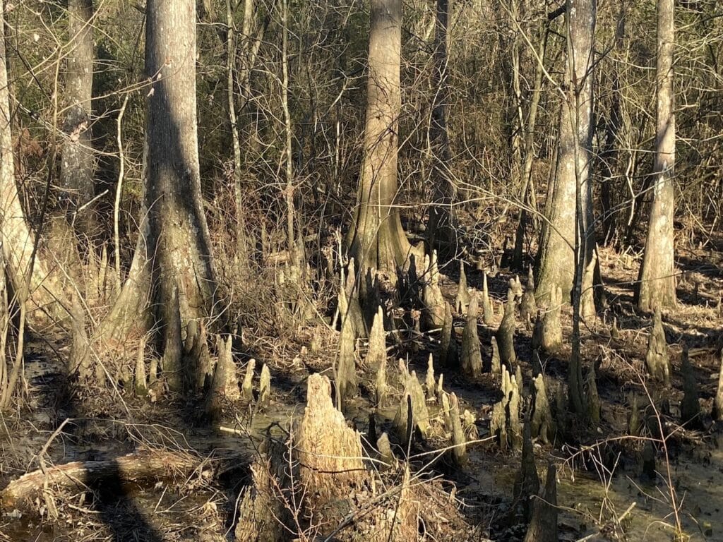 Les principaux arbres que l’on retrouvera dans les swamps sont le cyprès, le Tupelo 8 et le palétuvier.9 Le cyprès de Louisiane ou cyprès chauve Taxodium distichum, fait dorénavant partie de la famille des Cupressaceae. 10 Il s’adapte de manière remarquable au milieu aquatique très présent dans les sud des États-Unis. A maturité, il atteint les 30 à 50 mètres de haut pour un diamètre de tronc de 2 mètres. L’arbre vit de 300 à 500 ans. Une caractéristique est la remontée de ses racines tout autour du tronc plongé dans l’eau. Ce sont les pneumatophores qui sont des organes lignifiés, qui peuvent atteindre 1,7 m de haut, émergeant du sol ou de l’eau tout autour du tronc.