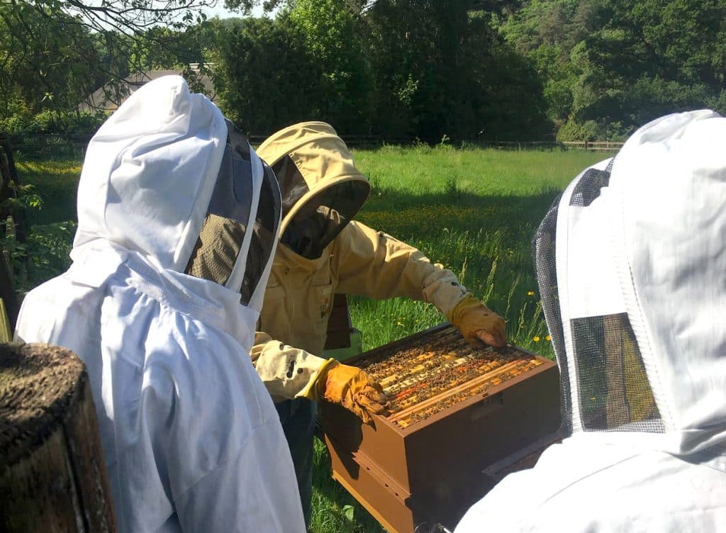 Olivier du Bus est devenu notre formateur en apiculture. Depuis la mi-juin 2018, Florian possède sa première ruche parmi les nombreuses se trouvant près des poules.