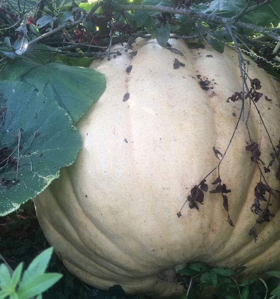 Au rayon des courgettes, les rondes de Nice et les courges sde la variété « Spaghetti » ont été prolifiques. Par contre, les Butternut sont aux abonnés absents avec seulement un seul exemplaire. Fort heureusement notre unique potiron Atlantic giant pourra combler ce déficit en soupe hivernale puisqu’elle devrait faire plus d’une centaine de kilos, ce qui est loin d’être un record pour cette variété ! Les courges Luffa nous donneront une récolte d’éponges abondantes et les courges gourdes nous apportera deux très belles bouteilles naturelles. Nous avons un potiron blanc rond que nous n’arrivons pas à identifier qui a déjà un fameux poids.