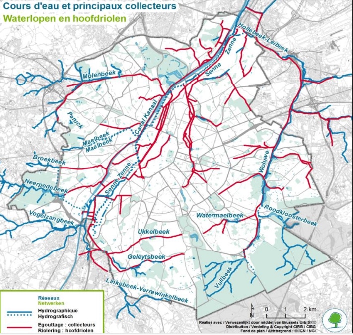 Comme on le voit dans la carte ci-dessous, les zones d’inondation de Bruxelles sont celles qui comportent les ruisseaux existants et les collecteurs.